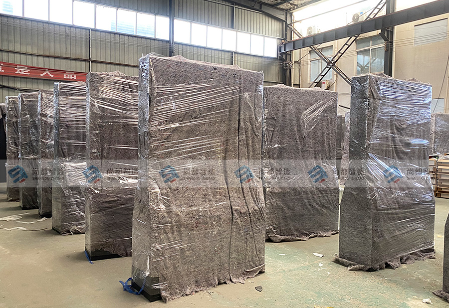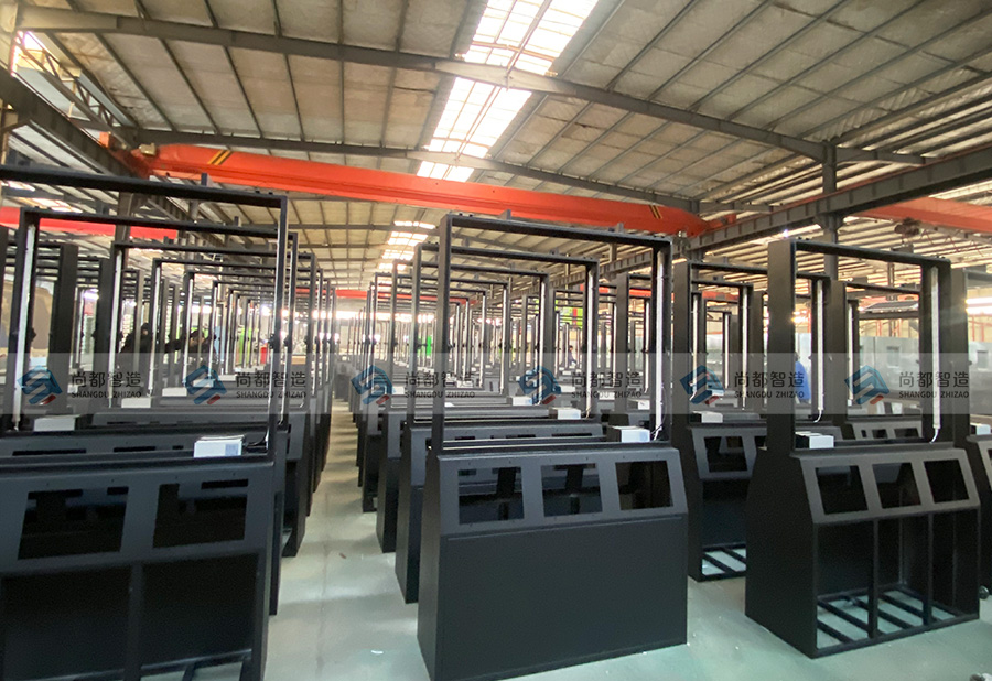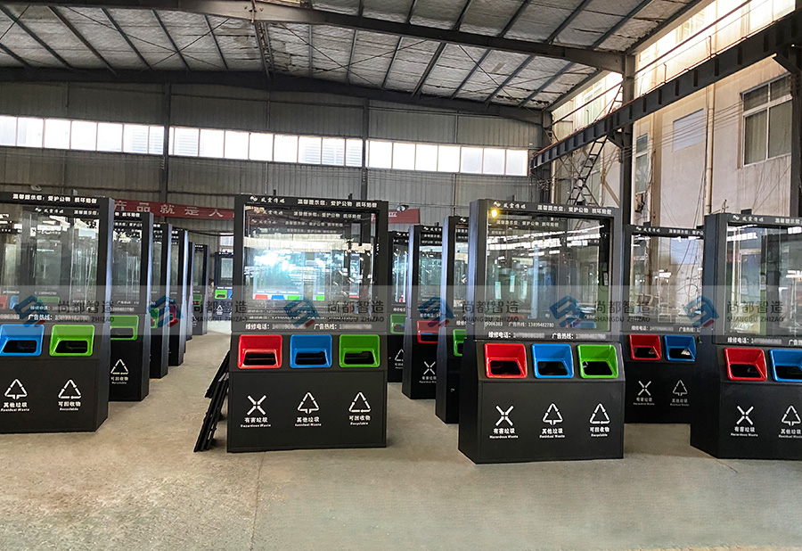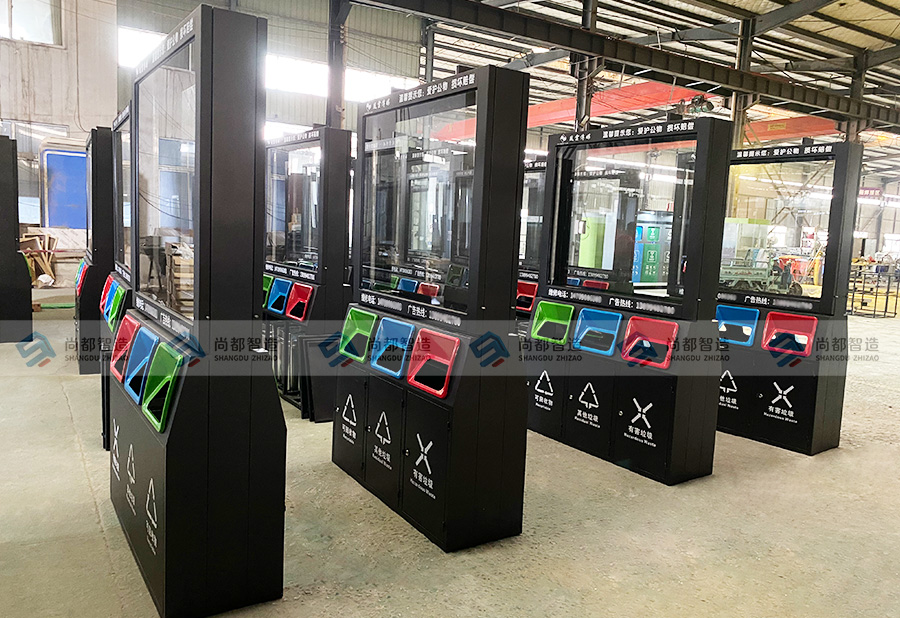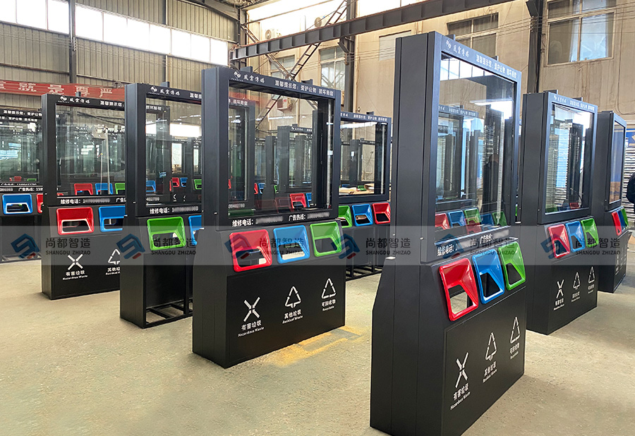 在江苏尚都城市智能科技有限公司的生产车间内,一批崭新的智能广告垃圾分类箱整齐排列,即将奔赴城市街头。